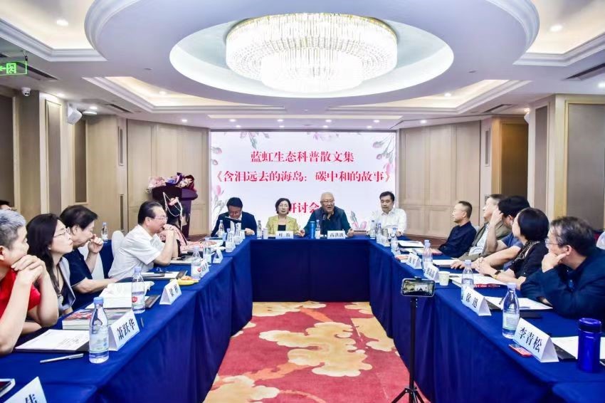 在全球氣候危機日益嚴峻的當(dāng)下,為了深化公眾對碳中和理解、激發(fā)社會各界環(huán)保行動熱情,中國散文學(xué)會、中國環(huán)境出版集團、中國人民大學(xué)生態(tài)環(huán)境學(xué)院在全國科普日活動周,于9月22日在北京重慶飯店多功能廳,共同舉辦了藍虹生態(tài)科普散文集《含淚遠去的海島:碳中和的故事》研討會,以推進散文、科普和生態(tài)環(huán)境知識的有機融合。中國作家協(xié)會原副主席高洪波,中國散文學(xué)會會長葉梅,中國環(huán)境出版集團黨委書記、董事長王付瑜,中國環(huán)境科學(xué)研究院黨委書記、院長李海生,生態(tài)環(huán)境部宣教司原司長、新聞發(fā)言人劉友賓,全國婦聯(lián)中國婦女出版社總編輯廖晶晶,中國作家協(xié)會社聯(lián)部主任李曉東,中國人民大學(xué)生態(tài)環(huán)境學(xué)院院長龐軍等來自各領(lǐng)域的專家、學(xué)者以及新華社、人民日報、光明日報等幾十家新聞媒體出席了研討會。研討會由中國散文學(xué)會常務(wù)副會長紅孩主持。