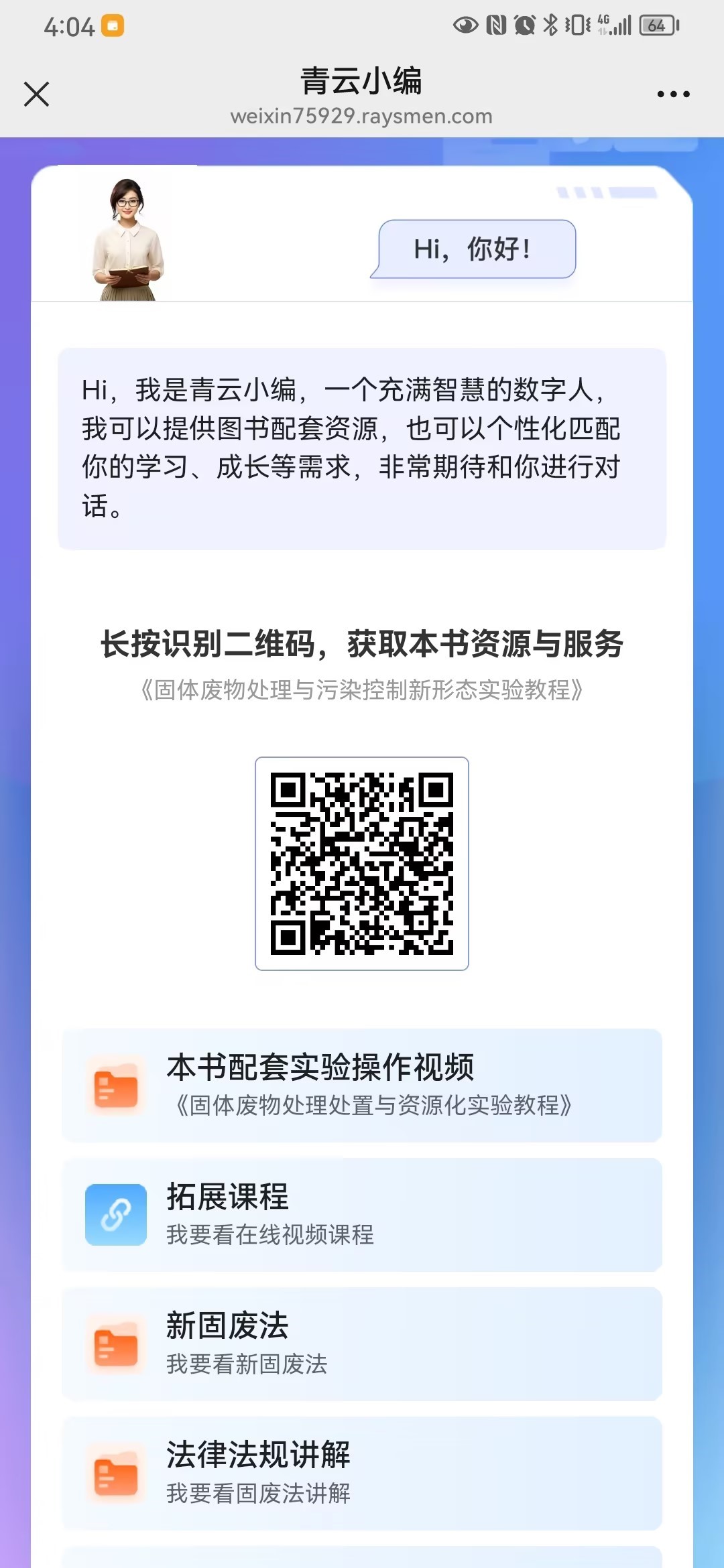 2023年開始,中國環境出版集團開始探索使用“AI數字人”應用。在《固體廢物處理與污染控制新形態實驗教程》(高校環境類新形態系列教材)中,“AI青云小編”便可實現人機交互問答,方便讀者獲取教材所配套的操作視頻、在線微課、相關法律解讀等,滿足個性化的學習、成長需求。
